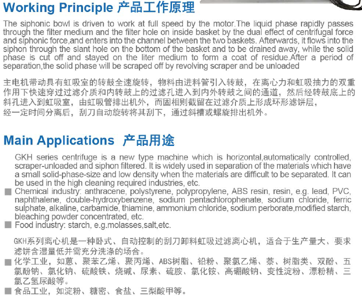 主電機帶動具有虹吸室的轉鼓全速旋轉,物料有進料管引入轉鼓,在離心力和虹吸抽力的雙重作用下快速穿過過濾介質和內轉鼓上的慮孔進入到內外轉鼓之間的通道,然后經(jīng)轉鼓底上的斜孔進入到虹吸室,由虹吸管排除機外,而固相則截留在過濾介質上形成環(huán)形濾餅層,經(jīng)一段時間分離后,刮刀自動旋轉將其刮下,通過斜槽或螺旋排出機外。