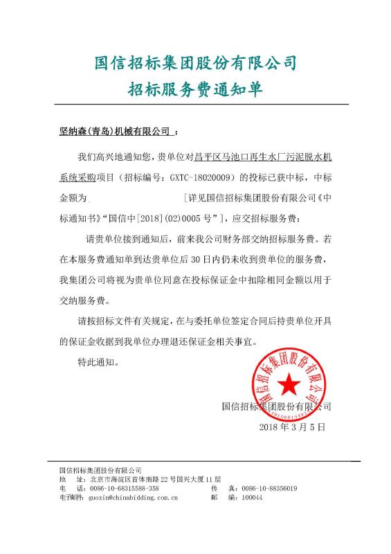 堅(jiān)納森中標(biāo)昌平區(qū)馬池口再生水廠污泥脫水機(jī)系統(tǒng)采購項(xiàng)目